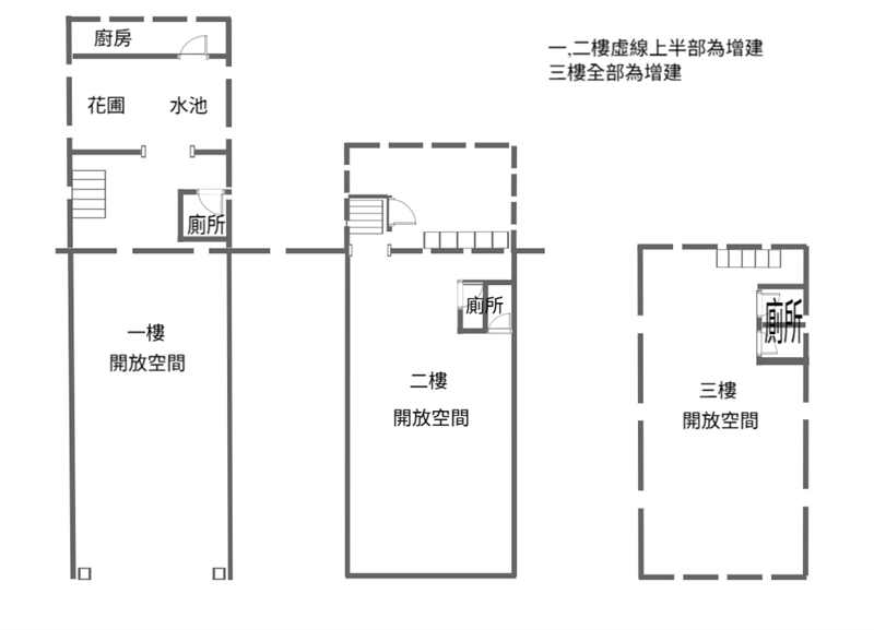 4.格局圖上,一二樓虛線上半部為增建,三樓全部為增建