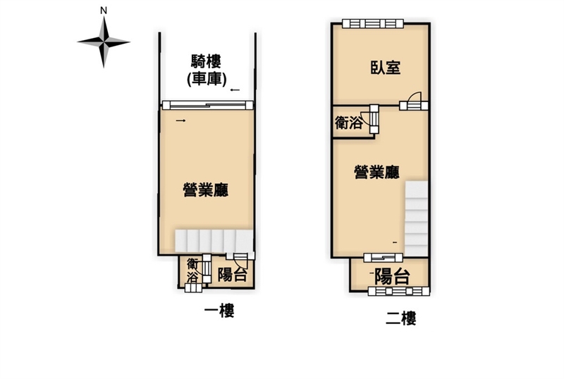 1.騎樓停車,一樓開放式營業廳,二樓有隔間可當臥室大空間好使用,前後採光,通風明亮